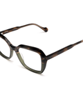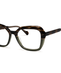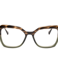 Lern Mutig kennen – die Brille, die sich nicht versteckt! Mit ihrer großen, eckigen Glasform und der Farbkombi aus transparentem Braun oben und sattem Dunkelgrün unten sagt die Kunststoffbrille ganz klar: „Ich bin da und ich liebe es, aufzufallen!“